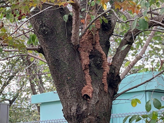私が勤務している秋葉台中学校で、オオスズメバチの巨大な巣が発見されました。