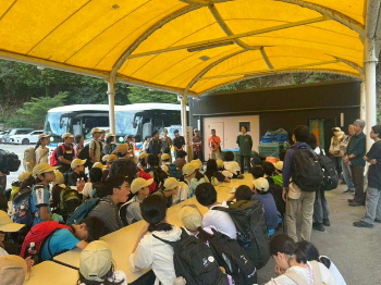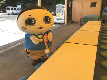 砂金採り体験をして、その後に展示コーナーで説明を受けました。 砂金採り元世界チャンピオンのお姉さんのお話も面白いし、身延町で採れた貝の化石が入った石も見せていただけました。 ぎっしりと貝が詰まっている石を手で触らせてもいただけました。海のない山梨県で貝の化石です。 副団長の山本先生も「早川町で勉強したことを直接確認することができてよかった」と言っていました。 そして、甲斐黄金村・湯之奥金山博物館のマスコット、もーん父さん(もんちゃん)がみんなの様子を見に来てくれました。